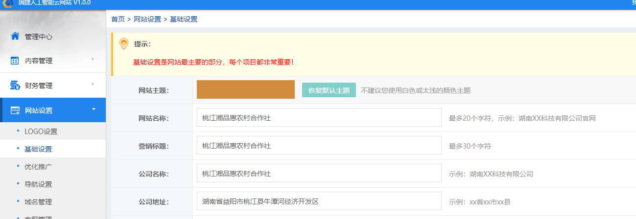 1、登陆后台,进入管理中心--网站设置---基础设置,这里有一个网站主题,可以点击后面的色条,想要什么主题颜色就选择什么颜色;